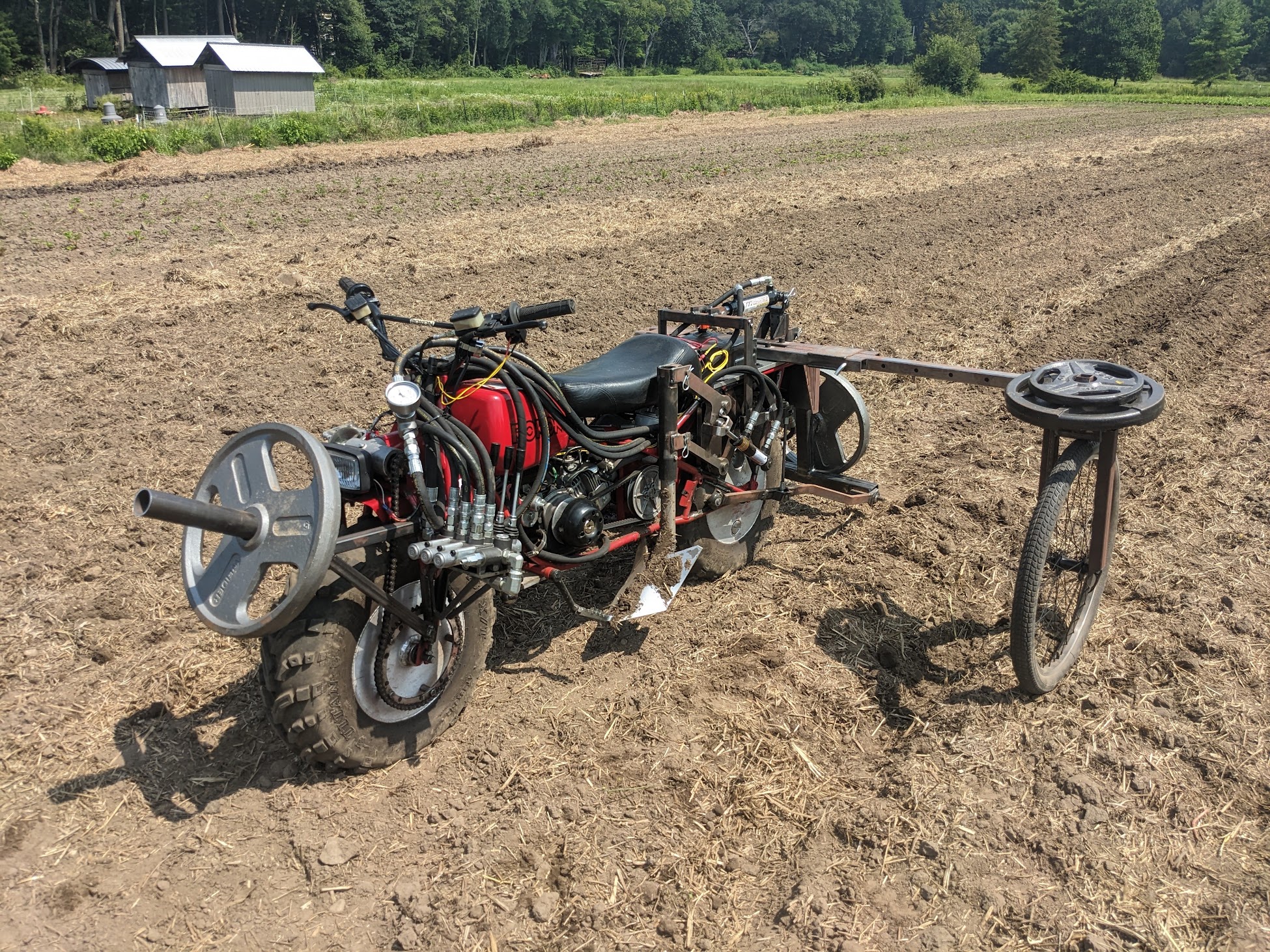A person accustomed to the stereotypical image of a big, shiny tractor, tricked out with dangerous-looking rows of blades or disks, could be forgiven their confusion over the odd, small machine Collin Goldbach helped design at the MIT GEAR Center. His tractor prototype features a two-wheel–drive motorcycle outfitted with a wedge-shaped piece of iron between the wheels, a miniature hydraulic lift at the back, a plastic tube that blows. Unlike the big, shiny tractor, which is an extremely sophisticated machine, the Bullkey, as it’s called, is made with tiny-scale producers in India in mind, who might otherwise use oxen for field labor.